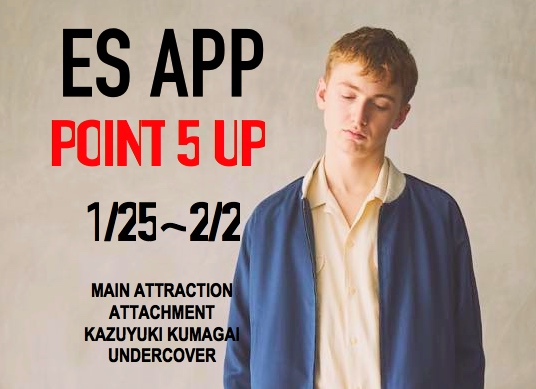ES APP POINT 5UP!! 2/1~MAIN ATTRACTION 2020S/Sがスタート予定! 立ち上がりイベントとして1/25~2/2の期間中はES APPのポイント5倍!を開催致します! 「通常税抜き¥100=1POINT」で加算されるところ、 この期間中対象であるブランドを購入された方のみが5倍ポイント申請!「¥100=5POINT」となります! アプリをお持ちの方が対象ですが、その場でアプリをダウンロードしても構いません! 皆様のご来場、お待ちしております!