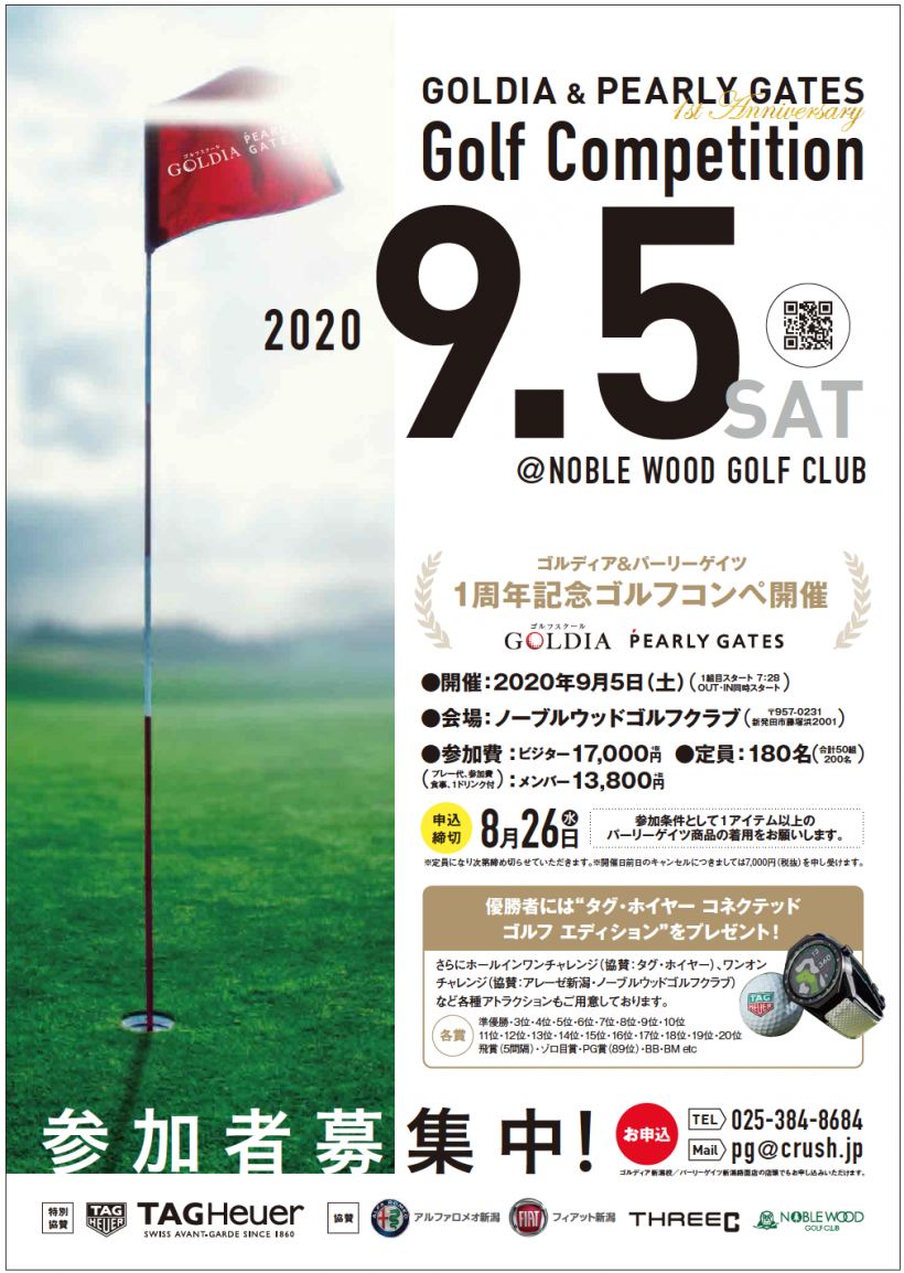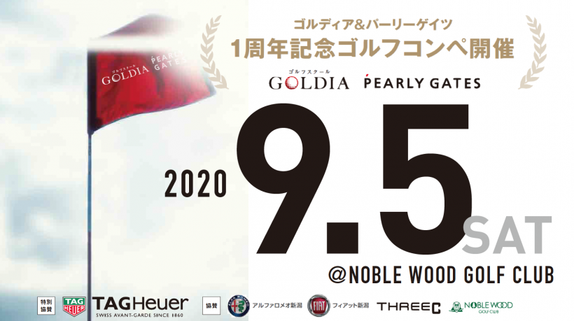 GOLDIA新潟校・PEARLY GATESオープン1周年記念コンペ開催! 昨年9月にOPENしましたゴルディア新潟校、パーリーゲイツ 新潟路面店のオープン1周年記念したコンペを開催いたします。 会場はノーブルウッドGC、優勝者にはTAG Heuerの新作GOLFウオッチを進呈。 参加条件は、パーリーゲイツ のアイテムを1アイテム以上着用!という条件のみ! 皆様のご参加お待ちしております。