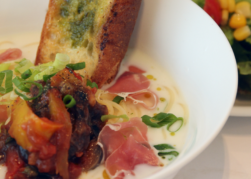 ●生ハムとラタトゥイユ、じゃがいもの冷製スープパスタ