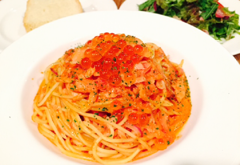 Bスモークサーモンとアーリーレッドのトマトクリームソース いくら添え /1,400 円